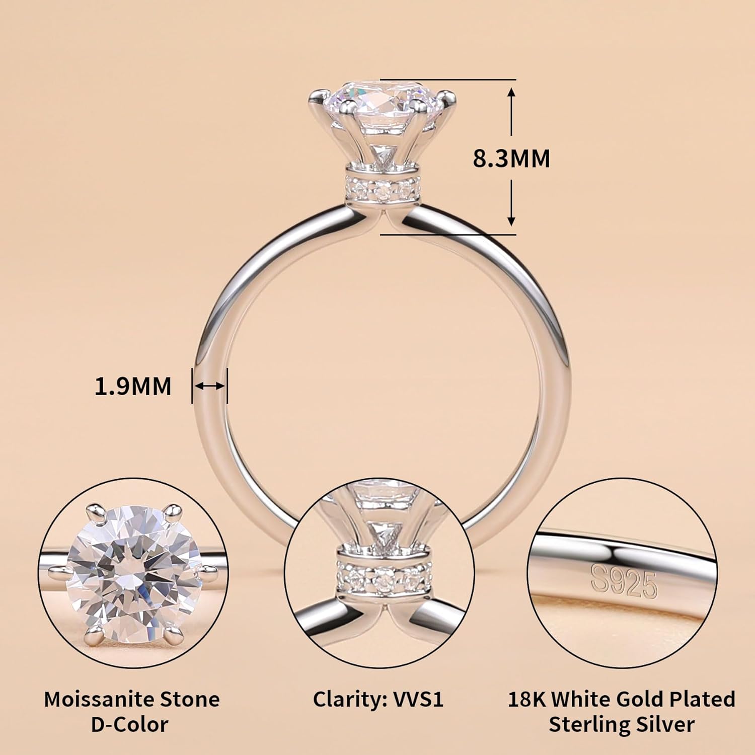 1CT Moissanite Engagement Ring for Women 6 Prongs Round Cut Solitaire Ring 18K White Gold Plated 925 Sterling Silver D Color VVS1 Lab Created Diamond Promise Ring for Her
